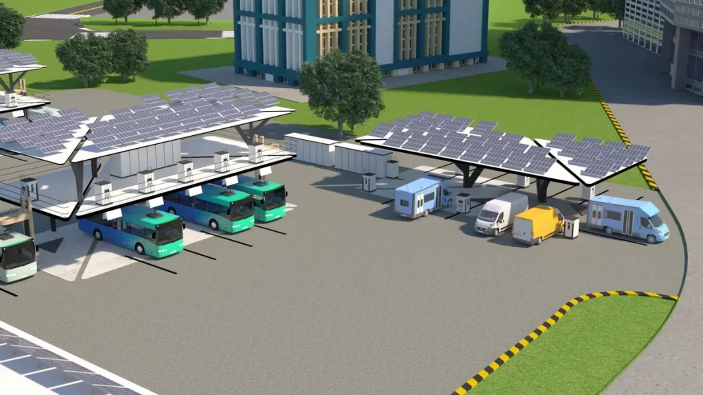The facility features a 50 kW solar array and 233 kWh battery energy storage system (BESS) working in concert with the charging infrastructure. During the day, solar panels generate power that charges the battery. At night, that stored energy powers vehicle charging, supplemented by grid electricity only as needed.